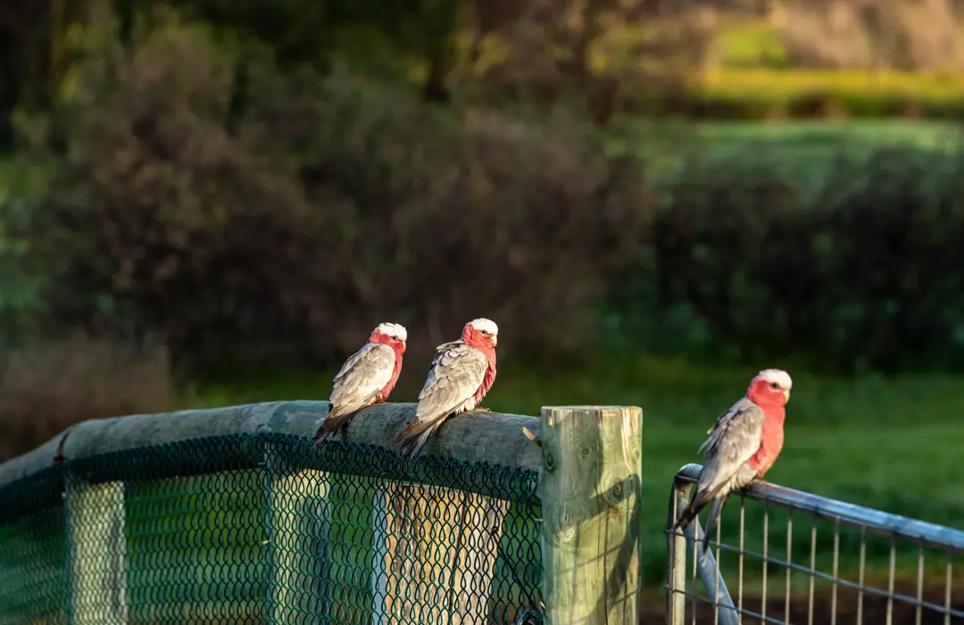 Three galahs (rose-breasted cockatoos) perched on a rustic wooden fence in a natural setting at Botania Park, Perth, bathed in warm sunlight with a lush green background.